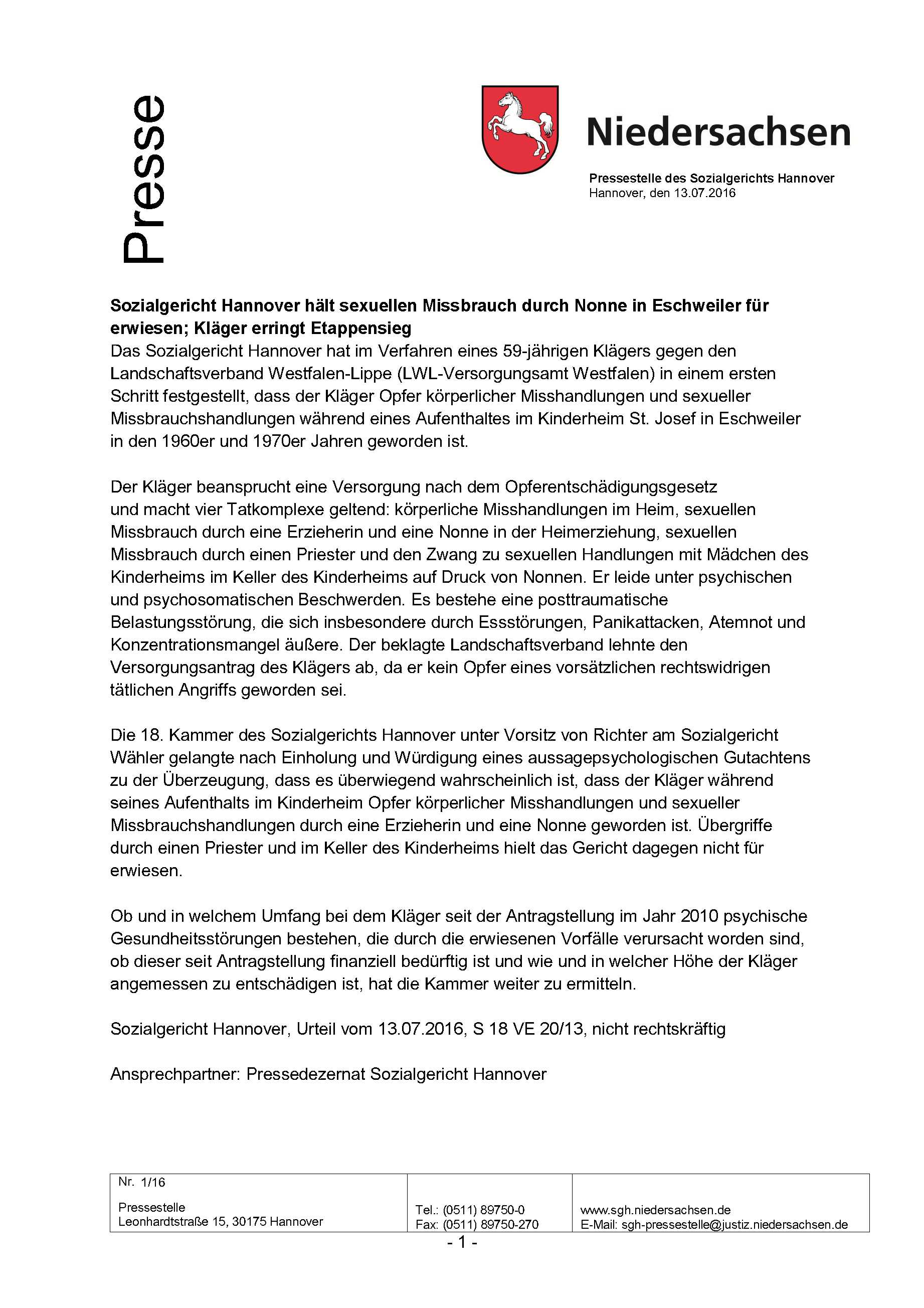 Sozialgericht Hannover hält sexuellen Missbrauch durch Nonne in Eschweiler für erwiesen.