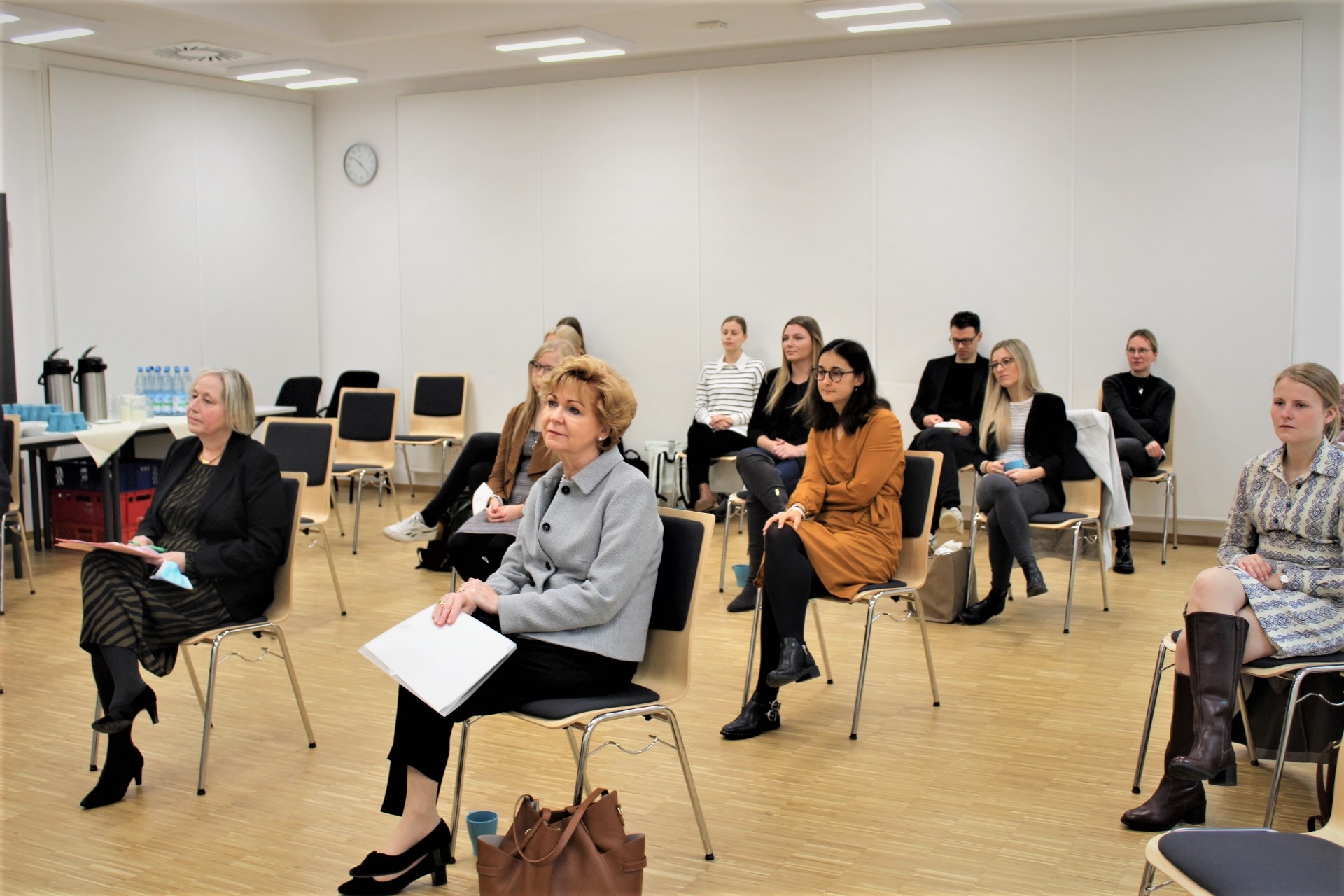 Dort wurde in einer simulierten Gerichtsverhandlung – durchgeführt von Mitarbeiterinnen und Mitarbeitern des Sozialgerichts, einer Rechtsanwältin und einer ehrenamtlichen Richterin – eine aktuelle Frage, basierend auf einer Entscheidung des Bundessozialgerichts, behandelt und diskutiert: verstößt es gegen die Verfassung, wenn Eltern in der Pflegeversicherung kein Beitragsnachlass für jedes Kind, das sie betreuen und erziehen, gewährt wird? Die Klägerin der simulierten Gerichtsverhandlung war Mitglied in der gesetzlichen Kranken- und Pflegeversicherung und Mutter von 5 Kindern. Bei der Pflegekasse stellte die Klägerin einen Antrag auf Reduktion der Beiträge zur Pflegeversicherung für jedes Kind. Sie vertrat die Auffassung, dass der in der gesetzlichen Pflegeversicherung existierende Beitragszuschlag für Kinderlose unzureichend sei. Beitragszahler mit (nur) einem Kind seien gegenüber solchen mit mehreren Kindern verfassungswidrig privilegiert, weil der Gesetzgeber die tatsächlichen Unterschiede in der Erziehungsleistung von Beitragszahlern mit mehr als einem Kind sachwidrig außer Acht lasse. Über diesen Sachverhalt und die grundsätzliche Frage, ob eine Entlastung von Eltern in Renten-, Kranken- oder Pflegeversicherung verfassungsrechtlich geboten ist, diskutierten im Anschluss an die simulierte Verhandlung mit der Ministerin mehrere Studierende und Rechtsreferendarinnen und Referendare. Einen Einblick in die Problematik und den Umgang mit diesen Fragen beim Bundesverfassungsgericht ermöglichte mit ihrem Vortrag Frau Dr. Andrea Bindig, Richterin am Landessozialgericht und zurzeit abgeordnet an das Bundesverfassungsgericht. Am Ende war die ganze Bandbreite von Meinungen vertreten und bestätigte die Worte der Präsidentin des Sozialgerichts Hannover, Gabriele Beyer, dass die Tätigkeit am Sozialgericht nicht nur abwechslungsreich, sondern auch gesellschaftlich aktuell ist.